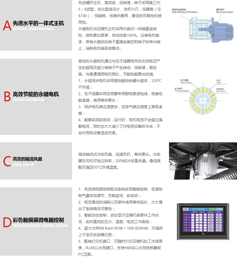 艾高EPM永磁變頻雙螺桿空壓機(jī)系列,獲得國(guó)家認(rèn)證節(jié)能減排產(chǎn)品,實(shí)測(cè)節(jié)能30%以上;通過ISO9001:2008國(guó)際質(zhì)量管理體系認(rèn)證產(chǎn)品。國(guó)際節(jié)能減排和新能源產(chǎn)業(yè)博覽會(huì)“節(jié)能減排優(yōu)秀獎(jiǎng)”